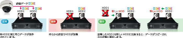 ハードディスクは消耗品で衝撃や振動に弱く常に故障の危険があり、万が一故障した場合、保存したデータの復旧は実質的に不可能です。HDDを2基搭載してそれぞれに同じデータを同時に記録するミラーリングをしておけば、1台のHDDが故障してももう1台にデータが残っていますので、大切なデータが失われるのを防ぐことができます。